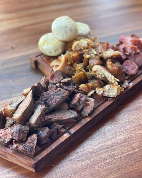 Mix de churrasco alcatra, file de sobre coxa, copa lombo suino, linguiça toscana, pão de alho. Acompanha arroz, farofa e vinagrete.