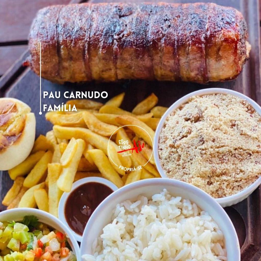 Carne moida temperada com molho especial, com queijo pre cozido e bacon. Acompanha arroz, farofa, vinagrete, molho barbecue e batata frita.
