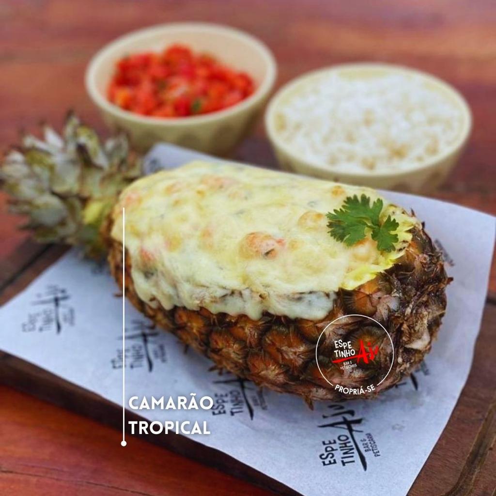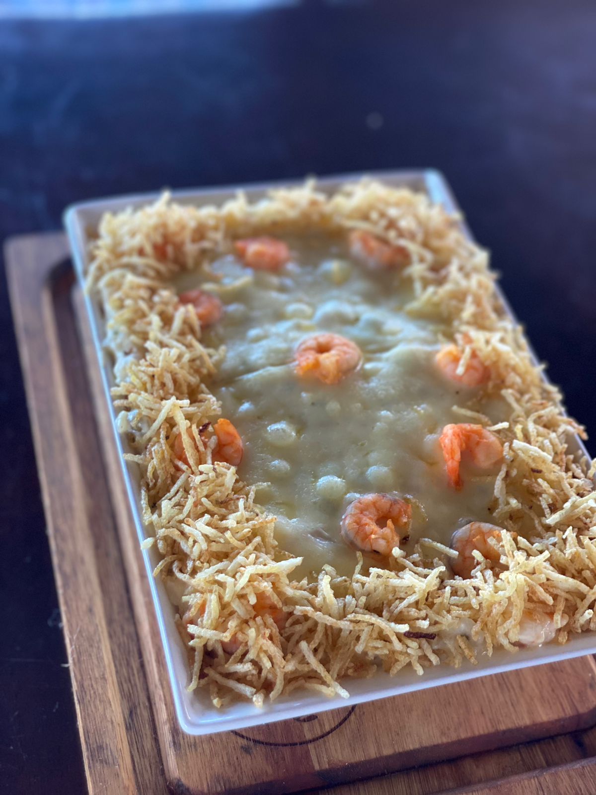 Deliciosos camarões salteados na manteiga com milho, ervilha, presunto e molho branco gratinado com queijo e finalizado com batata palha.