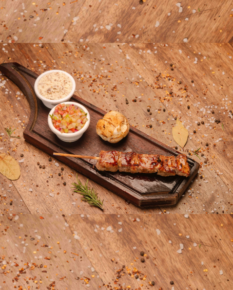 Pedaços de filé espetados e envolvidos ao creme de alho, acompanha vinagrete, farofa e pão de alho.